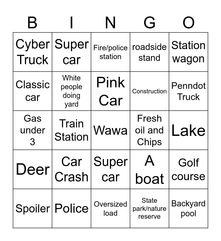 This bingo card has a free space and 24 words: Car Crash, Police, Pink Car, Spoiler, Station wagon, Cyber Truck, Classic car, Super car, Fresh oil and Chips, Super car, Construction, Gas under 3, A boat, Golf course, White people doing yard, State park/nature reserve, Lake, Fire/police station, Penndot Truck, Train Station, Backyard pool, Deer, roadside stand and Oversized load.