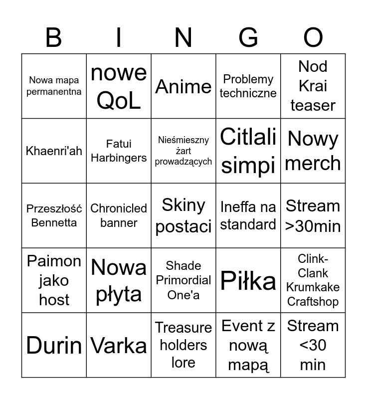 This bingo card has a free space and 41 words: Ancient Name dla Bennetta, Przeszłość Bennetta, Mare Jivari, Fatui Harbingers, Varka, Shade Primordial One'a, Nieśmieszny żart prowadzących, Ineffa tańczy, Nod Krai teaser, Paimon jako host, Chronicled banner, Problemy techniczne, Stream <30 min, Stream >30min, Ineffa na standard, Nowa płyta, Nowy collab, Nowa mapa permanentna, coś nowego o lore Księżycy, Anime, Clink-Clank Krumkake Craftshop, Bakunawa, Treasure holders lore, Citlali simpi, Tsaritsa, wskrzeszenie Capitano, Event z nową mapą, Zapowiedz animacji/nowa animacja, Nowy merch, Buff postaci, Hexenzirkel, nowe QoL, Durin, Sylwetki nowych postaci, Piłka, Khaenri'ah, KLEE, Nowy permanentny tryb gry, Banger event, Nudny event and Nowe karty w TCG.