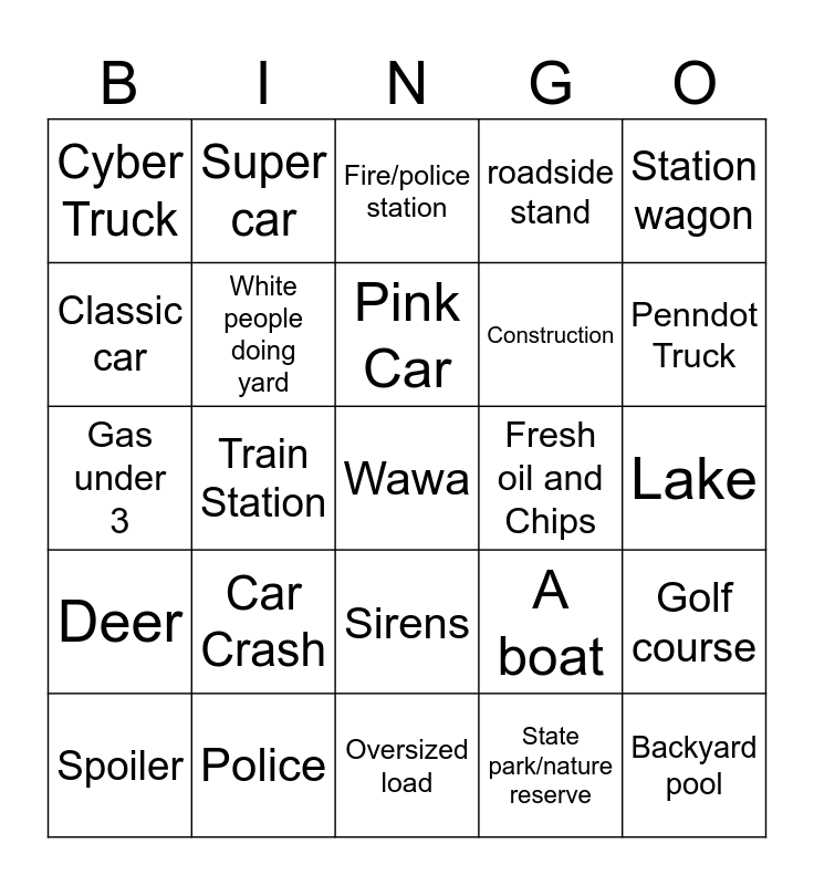 This bingo card has a free space and 24 words: Car Crash, Police, Pink Car, Spoiler, Station wagon, Cyber Truck, Classic car, Super car, Fresh oil and Chips, Sirens, Construction, Gas under 3, A boat, Golf course, White people doing yard, State park/nature reserve, Lake, Fire/police station, Penndot Truck, Train Station, Backyard pool, Deer, roadside stand and Oversized load.