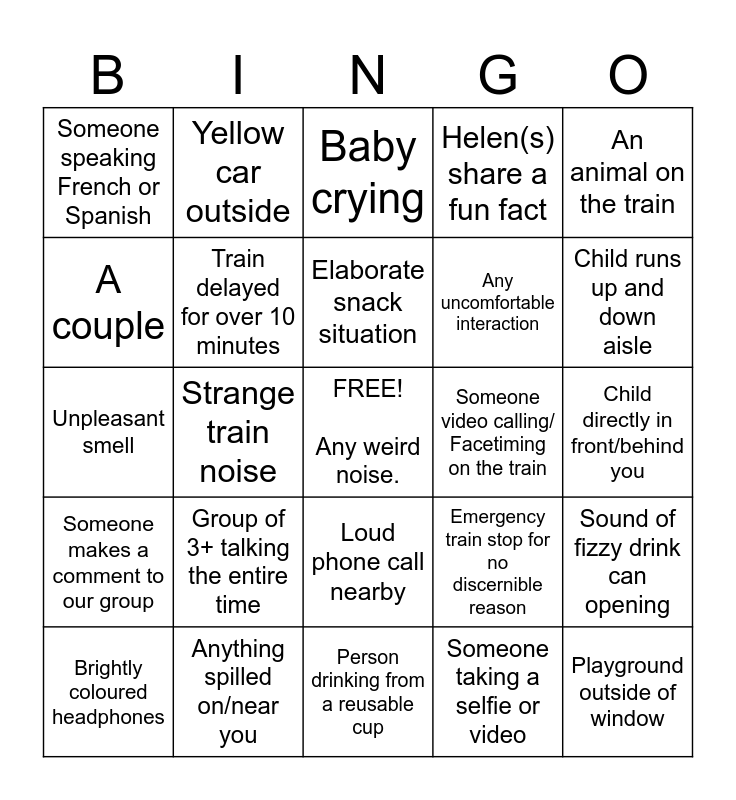 This bingo card has a free space and 29 words: Brightly coloured headphones, Person asleep on the train, Strange train noise, Loud, chatty people, Someone speaking French or Spanish, Baby crying, Train delayed for over 10 minutes, Group of 3+ talking the entire time, Someone video calling/ Facetiming on the train, Anything spilled on/near you, Child directly in front/behind you, Playground outside of window, Person drinking from a reusable cup, Someone taking a selfie or video, Child runs up and down aisle, Someone carrying a backpack or work-type bag, Loud phone call nearby, Someone makes a comment to our group, An animal on the train, Unpleasant smell, Emergency train stop for no discernible reason, Video game/ app not on silent, Any uncomfortable interaction, A couple, Helen(s) share a fun fact, Yellow car outside, Sound of fizzy drink can opening, Elaborate snack situation and Someone wearing socks with crocs.