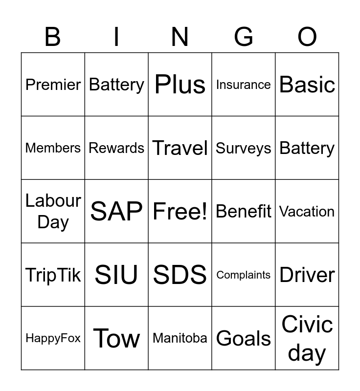 This bingo card has a free space and 29 words: Climate, Tow, Plus, Everyday, Basic, Premier, Rewards, Travel, Benefit, Driver, HappyFox, SAP, Goals, Civic day, Labour Day, 60 CVD, Manitoba, Complaints, Battery, TripTik, SIU, ERS Claims, Surveys, Vacation, Members, Battery, SDS, Insurance and Auto.