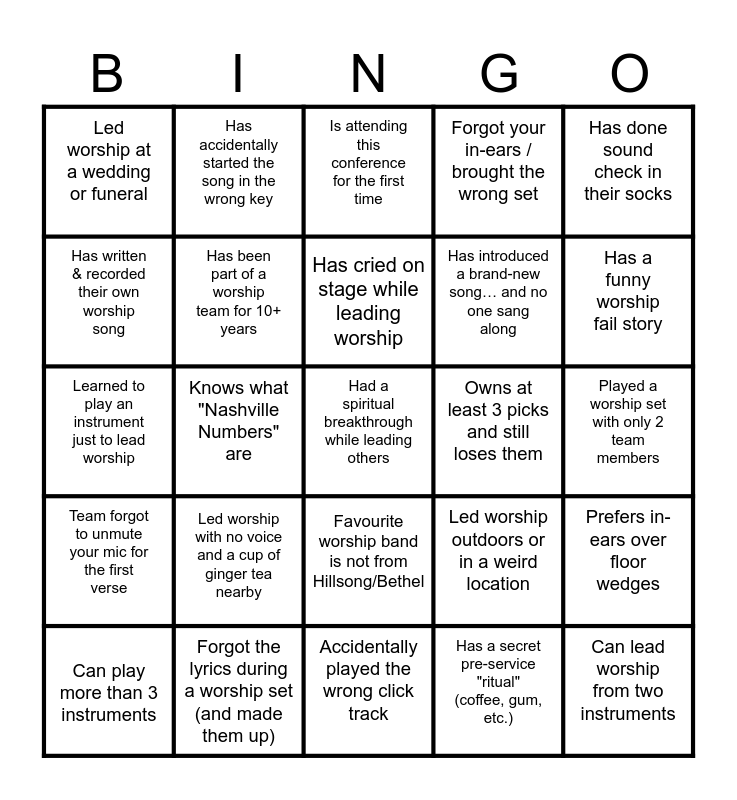 This bingo card has a free space and 24 words: Led worship with no voice and a cup of ginger tea nearby, Forgot the lyrics during a worship set (and made them up), Has cried on stage while leading worship, Can play more than 3 instruments, Has done sound check in their socks, Led worship at a wedding or funeral, Has written & recorded their own worship song, Has accidentally started the song in the wrong key, Owns at least 3 picks and still loses them, Favourite worship band is not from Hillsong/Bethel, Has introduced a brand-new song… and no one sang along, Learned to play an instrument just to lead worship, Led worship outdoors or in a weird location, Prefers in-ears over floor wedges, Has been part of a worship team for 10+ years, Has a secret pre-service "ritual" (coffee, gum, etc.), Played a worship set with only 2 team members, Is attending this conference for the first time, Has a funny worship fail story, Knows what "Nashville Numbers" are, Can lead worship from two instruments, Team forgot to unmute your mic for the first verse, Forgot your in-ears / brought the wrong set and Accidentally played the wrong click track.