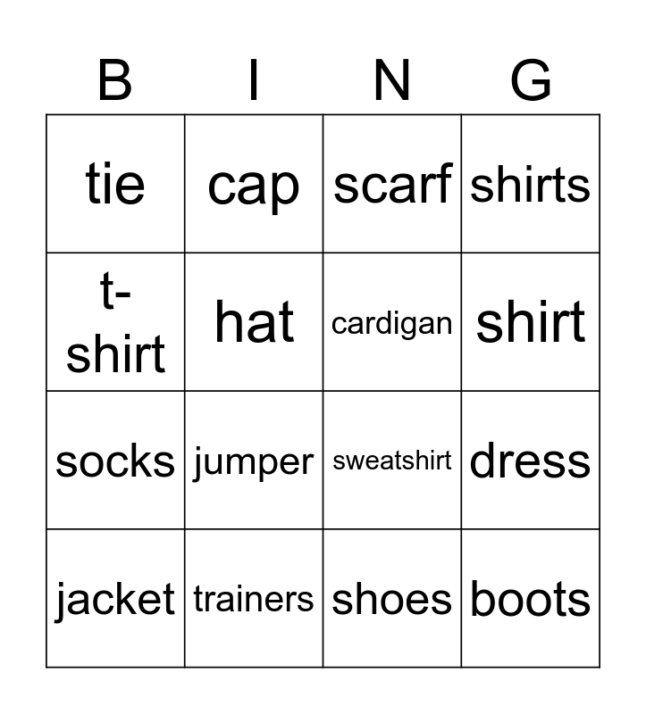 This bingo card has 25 words: trousers, skirt, shirt, top, t-shirt, tie, hat, cap, trainers, sunglasses, socks, sweatshirt, waistcoat, blouse, cardigan, pyjamas, shoes, scarf, jumper, dress, jacket, jeans, boots, shirts and coat.