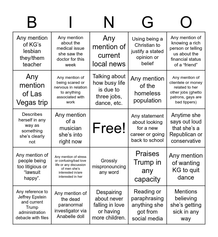 This bingo card has a free space and 24 words: Any mention of stress or confusing/bad love life or any discussion of men she’s interested in/are interested in her, Any mention of the dead paranormal investigator via Anabelle doll, Talking about how busy life is due to three jobs, dance, etc., Any reference to Jeffrey Epstein and current Trump administration debacle with files, Any mention of knowing a rich person or telling us about the financial status of a “friend”, Any mention of KG’s lesbian they/them teacher, Any mention of Las Vegas trip, Any mention about the medical issue she saw the doctor for this week, Any statement about looking for a new career or going back to school, Grossly mispronouncing any word, Any mention of the homeless population, Describes herself in any way as something she’s clearly not, Praises Trump in any capacity, Any mention of wanting KG to quit dance, Any mention of being scared or nervous in relation to anything associated with work, Reading or paraphrasing anything she got from social media, Anytime she says out loud that she’s a Republican or conservative, Any mention of current local news, Any mention of clientele or money related to her other jobs (ghetto patrons, gays are bad tippers), Any mention of a musician she’s into right now, Mentions believing she’s getting sick in any way, Any mention of people being too litigious or “lawsuit happy”., Using being a Christian to justify a stated opinion or belief and Despairing about never falling in love or having more children..