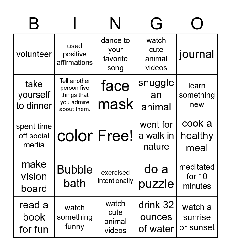 This bingo card has a free space and 24 words: Bubble bath, watch something funny, face mask, read a book for fun, journal, volunteer, take yourself to dinner, used positive affirmations, went for a walk in nature, exercised intentionally, snuggle an animal, spent time off social media, do a puzzle, meditated for 10 minutes, Tell another person five things that you admire about them., drink 32 ounces of water, cook a healthy meal, dance to your favorite song, learn something new, color, watch a sunrise or sunset, make vision board, watch cute animal videos and watch cute animal videos.