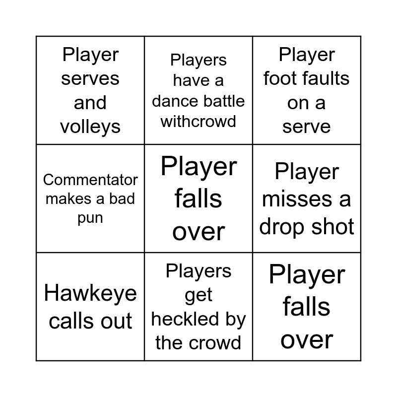 This bingo card has a free space and 42 words: Player hits a smash, Players get heckled by the crowd, Player foot faults on a serve, Commentators gets the score wrong, Players hits a trick shot, Player hits a underarm serve, Fan buys commentators a drink :), Fan heckles player after a really bad mistake item, Player foot faults on a serve, Funny joke by commentators, Rally lasts 15 shots, Fan commentates for a few points, Player wears a silly accessory, Player falls over, Fan commentate for a few points, Commentator insults player, Down the line winner, Double fault occurs, Game point saved, Players have a dance battle withcrowd, Player misses a drop shot, Standing ovation from the crowd, Player has a temper tantrum, Player serves and volleys, Player blames partner, Hits an ace, Excessively loud grunt, Players swap rackets for a point, Player dives for a shot, Crowd starts a chant, Fan holds up a funny sign, Player swaps hand whilst playing, Hawkeye calls out, Fan plays in for a game, Player switches sides mid rally, Player misses a no-look shot, Crowd starts Mexican Wave, Ball goes over fence, Player misses a tweener, Commentator spills something, Commentator makes a bad pun and Hawkeye shows ball in.