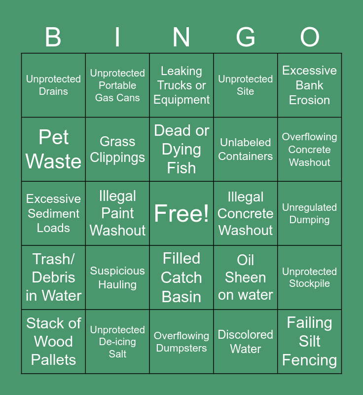 This bingo card has a free space and 36 words: Cloudy water, Illegal Oil Dumping, Meth Lab Debris, Grass Clippings, Oil Sheen on water, Trash/ Debris in Water, Dead or Dying Fish, Leaves or Branches in Drains, Excessive Bank Erosion, Mud on Roadways, Illegal Paint Washout, Unprotected Site, Unprotected Chemicals, Illegal Concrete Washout, Overflowing Concrete Washout, Unprotected Drains, Illegal Land Clearing, Suspicious Hauling, Failing Silt Fencing, Leaking Trucks or Equipment, Unregulated Dumping, Unprotected Stockpile, Unprotected De-icing Salt, Stack of Wood Pallets, Overflowing Dumpsters, Unprotected Portable Gas Cans, Excessive Sediment Loads, Soapy Residues in Water, Unlabeled Containers, Pet Waste, Yard Fertilizer, Leaking Dumpster, Discolored Water, Filled Catch Basin, Stacked Wood Pallets and Improper Fueling Area.