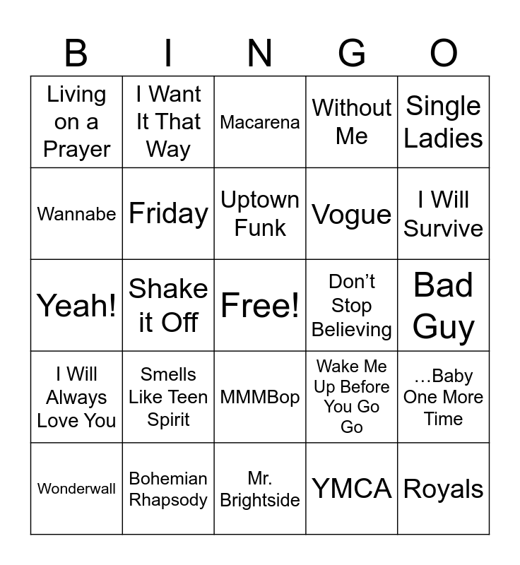 This bingo card has a free space and 37 words: Party Rock Anthem, Gangnam Style, Wrecking Ball, Friday, …Baby One More Time, Smells Like Teen Spirit, Uptown Funk, My Heart Will Go On, Single Ladies, Old Town Road, Shake it Off, Without Me, Royals, Bad Guy, Wannabe, I Will Always Love You, Harlem Shake, Macarena, MMMBop, Don’t Stop Believing, Living on a Prayer, I Will Survive, Wonderwall, Mr. Brightside, Dancing Queen, YMCA, I Want It That Way, Hey Ya, Girls Just Wanna Have Fun, Sweet Caroline, Satisfaction, Bohemian Rhapsody, Yeah!, I Wanna Hold Your Hand, Wake Me Up Before You Go Go, Vogue and Livin’ La Vida Loca.