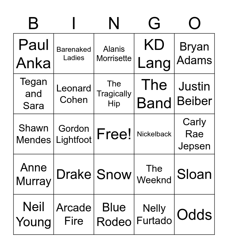 This bingo card has a free space and 33 words: The Guess Who, Joni Mitchel, Gordon Lightfoot, Rush, Anne Murray, Leonard Cohen, Bryan Adams, Neil Young, Barenaked Ladies, Celine Dion, The Tragically Hip, Alanis Morrisette, Shania Twain, Avril Lavigne, Nickelback, Justin Beiber, Arcade Fire, Shawn Mendes, Drake, The Weeknd, Snow, Michel Bublé, Paul Anka, Carly Rae Jepsen, Blue Rodeo, Odds, KD Lang, The Band, Tegan and Sara, Sloan, Loverboy, Nelly Furtado and Corey Hart.