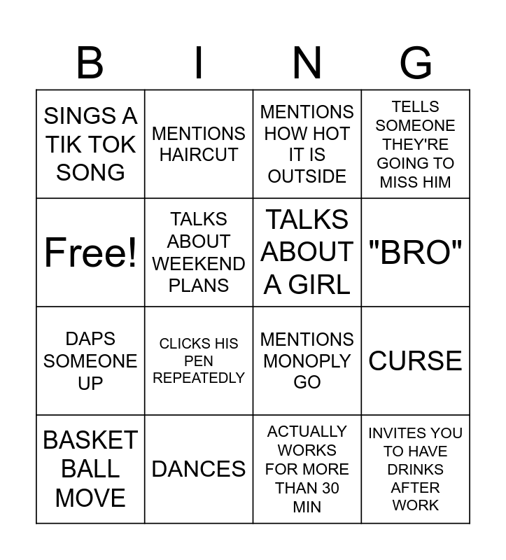 This bingo card has 16 words: DANCES, CURSE, MENTIONS HOW HOT IT IS OUTSIDE, SINGS A TIK TOK SONG, DAPS SOMEONE UP, MENTIONS HAIRCUT, MENTIONS MONOPLY GO, ACTUALLY WORKS FOR MORE THAN 30 MIN, Free!, TALKS ABOUT WEEKEND PLANS, BASKET BALL MOVE, TELLS SOMEONE THEY'RE GOING TO MISS HIM, CLICKS HIS PEN REPEATEDLY, "BRO", TALKS ABOUT A GIRL and INVITES YOU TO HAVE DRINKS AFTER WORK.
