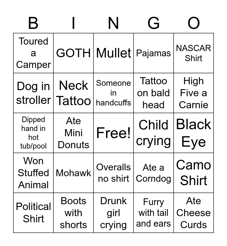 This bingo card has a free space and 24 words: Political Shirt, Mohawk, Someone in handcuffs, Furry with tail and ears, NASCAR Shirt, Toured a Camper, GOTH, Mullet, Child crying, Black Eye, Dipped hand in hot tub/pool, Neck Tattoo, Ate a Corndog, Camo Shirt, Dog in stroller, Boots with shorts, Drunk girl crying, Pajamas, High Five a Carnie, Won Stuffed Animal, Ate Mini Donuts, Overalls no shirt, Tattoo on bald head and Ate Cheese Curds.