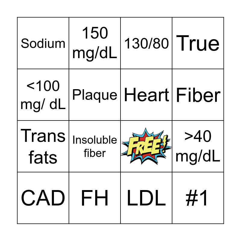 This bingo card has 1 images and 20 words: FH, HDL, 150 mg/dL, False, LDL, Heart, Sodium, 130/80, Fiber, Trans fats, True, #1, Saturated fats, Plaque, Blood vessels, CAD, Insoluble fiber, <100 mg/ dL, >40 mg/dL and 50%.