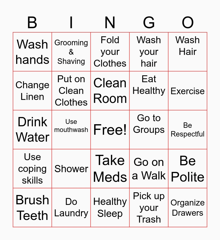 This bingo card has a free space and 24 words: Shower, Do Laundry, Clean Room, Brush Teeth, Wash Hair, Wash hands, Change Linen, Grooming & Shaving, Go to Groups, Take Meds, Eat Healthy, Drink Water, Go on a Walk, Be Polite, Put on Clean Clothes, Pick up your Trash, Be Respectful, Fold your Clothes, Exercise, Use mouthwash, Organize Drawers, Use coping skills, Wash your hair and Healthy Sleep.