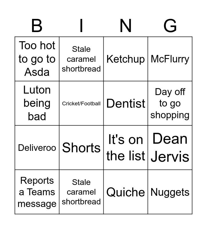 This bingo card has 18 words: Shorts, Nuggets, Ketchup, Too hot to go to Asda, It's on the list, McFlurry, Reports a Teams message, Stale caramel shortbread, Day off to go shopping, Deliveroo, Quiche, Luton being bad, Dean Jervis, Cricket/Football, Dentist, Recharges whilst staring at the wall, Stale caramel shortbread and Dentist.