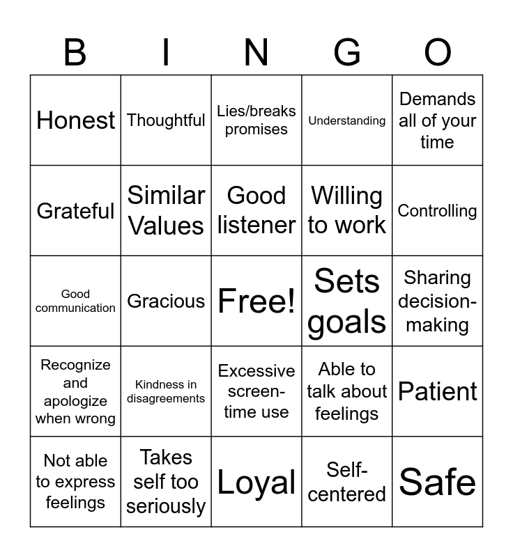 This bingo card has a free space and 34 words: Balanced giving and receiving, Self-centered, Defensiveness, Able to compromise, Recognize and apologize when wrong, Similar Values, Demands all of your time, Not able to express feelings, Thoughtful, Balancing time, Good listener, Lies/breaks promises, Have fun together, Active listening, Sets goals, Controlling, Takes self too seriously, Good communication, Kindness in disagreements, Able to talk about feelings, Excessive screen-time use, Being too critical, Honest, Sharing decision-making, Loyal, Safe, Understanding, Selfless, Willing to work, Grateful, Merciful, Gracious, Patient and Kind.