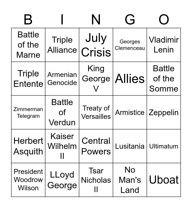This bingo card has 25 words: Kaiser Wilhelm II, Tsar Nicholas II, King George V, President Woodrow Wilson, Vladimir Lenin, Battle of the Marne, Triple Entente, Triple Alliance, Armistice, Central Powers, Allies, Zimmerman Telegram, Lusitania, Ultimatum, Armenian Genocide, Uboat, Zeppelin, July Crisis, Battle of the Somme, Battle of Verdun, Treaty of Versailles, LLoyd George, Herbert Asquith, Georges Clemenceau and No Man's Land.