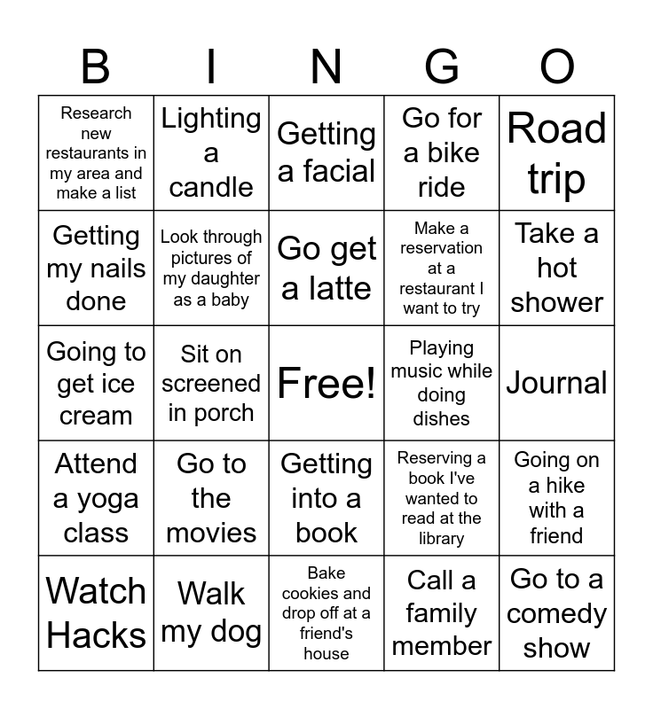 This bingo card has a free space and 24 words: Go to the movies, Walk my dog, Go get a latte, Watch Hacks, Road trip, Research new restaurants in my area and make a list, Getting my nails done, Lighting a candle, Playing music while doing dishes, Getting into a book, Make a reservation at a restaurant I want to try, Going to get ice cream, Reserving a book I've wanted to read at the library, Going on a hike with a friend, Look through pictures of my daughter as a baby, Call a family member, Journal, Getting a facial, Take a hot shower, Sit on screened in porch, Go to a comedy show, Attend a yoga class, Go for a bike ride and Bake cookies and drop off at a friend's house.