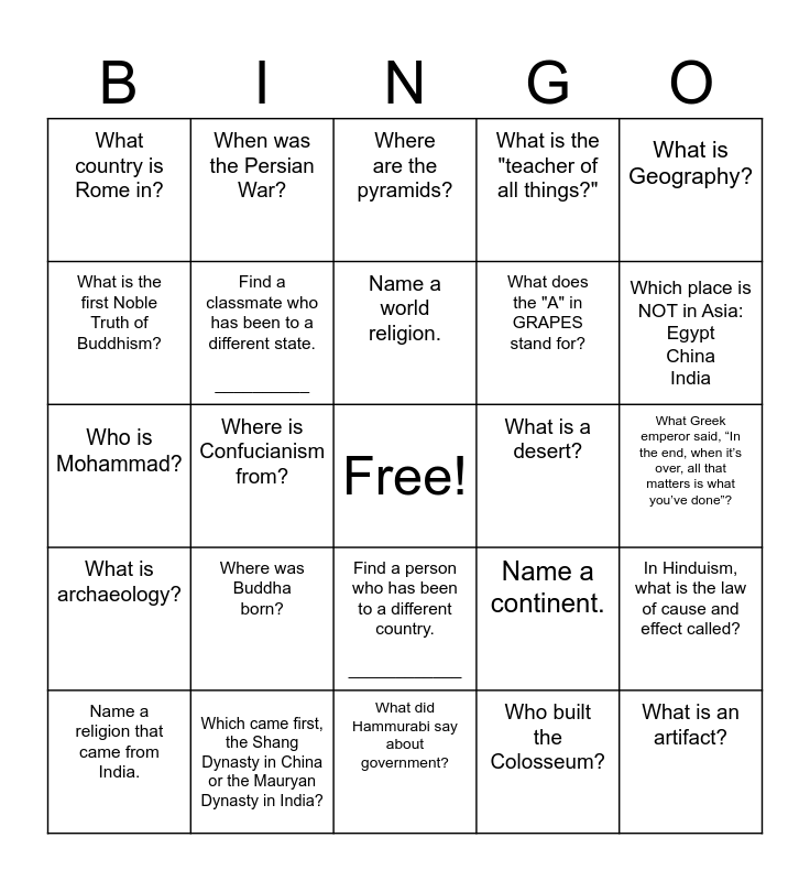 This bingo card has a free space and 33 words: What does BCE mean?, What Sea separates Europe and Africa?, Where is Confucianism from?, Where did Judaism start?, What is archaeology?, Find a classmate who has been to a different state. __________, What is Geography?, Name a religion that came from India., When was the Persian War?, Who founded Christianity?, Name a world religion., Where are the pyramids?, Where is the Great Wall?, What is history?, What is a desert?, Which place is NOT in Asia: Egypt China India, Which came first, the Shang Dynasty in China or the Mauryan Dynasty in India?, Who is Mohammad?, Where was Buddha born?, Name a continent., Find a person who has been to a different country. ____________, What is the river in Egypt?, What country is Rome in?, What Greek emperor said, “In the end, when it’s over, all that matters is what you’ve done”?, What did Hammurabi say about government?, What is an artifact?, What is the "teacher of all things?", What does the "A" in GRAPES stand for?, What is the first Noble Truth of Buddhism?, In Hinduism, what is the law of cause and effect called?, What is one of the Pillars of Islam?, Who built the Colosseum? and Name a relationship in Confucianism..