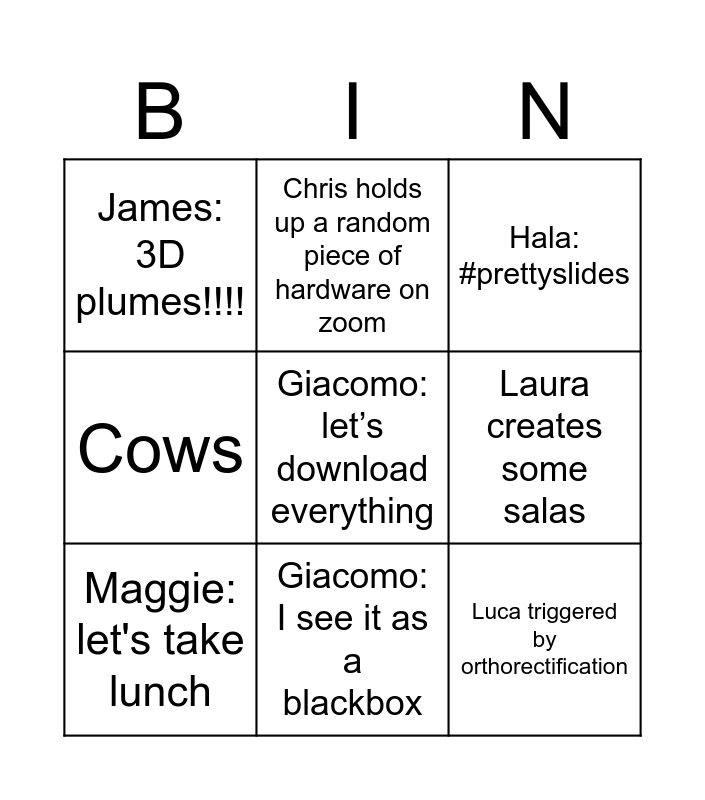 This bingo card has a free space and 8 words: Laura creates some salas, Hala: #prettyslides, Chris holds up a random piece of hardware on zoom, Maggie: let's take lunch, James: 3D plumes!!!!, Luca triggered by orthorectification, Cows and Giacomo: I see it as a blackbox.