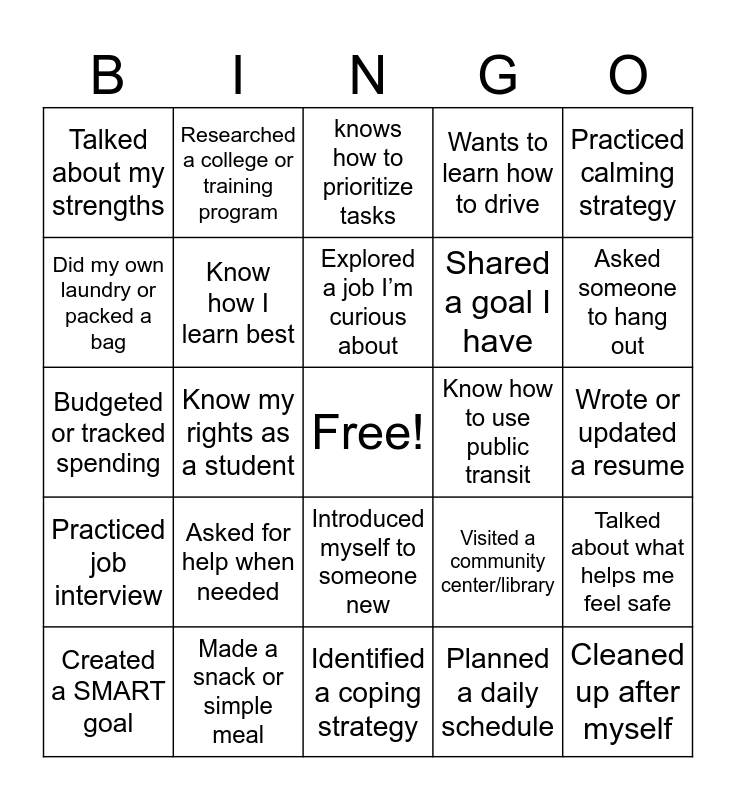 This bingo card has a free space and 24 words: Asked for help when needed, Made a snack or simple meal, Explored a job I’m curious about, Created a SMART goal, Practiced calming strategy, Talked about my strengths, Did my own laundry or packed a bag, Researched a college or training program, Know how to use public transit, Introduced myself to someone new, Shared a goal I have, Budgeted or tracked spending, Visited a community center/library, Talked about what helps me feel safe, Know how I learn best, Planned a daily schedule, Wrote or updated a resume, knows how to prioritize tasks, Asked someone to hang out, Know my rights as a student, Cleaned up after myself, Practiced job interview, Wants to learn how to drive and Identified a coping strategy.
