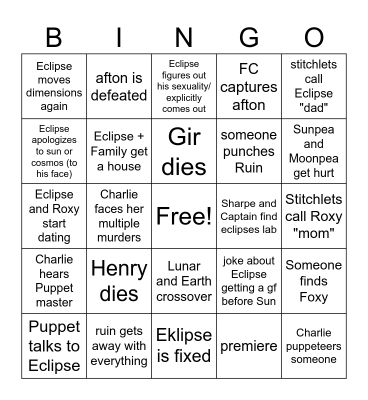 This bingo card has a free space and 24 words: Henry dies, ruin gets away with everything, Gir dies, Puppet talks to Eclipse, stitchlets call Eclipse "dad", Eclipse moves dimensions again, Eclipse apologizes to sun or cosmos (to his face), afton is defeated, Sharpe and Captain find eclipses lab, Lunar and Earth crossover, someone punches Ruin, Eclipse and Roxy start dating, joke about Eclipse getting a gf before Sun, Someone finds Foxy, Eclipse + Family get a house, premiere, Stitchlets call Roxy "mom", Eclipse figures out his sexuality/ explicitly comes out, Sunpea and Moonpea get hurt, Charlie faces her multiple murders, Charlie puppeteers someone, Charlie hears Puppet master, FC captures afton and Eklipse is fixed.