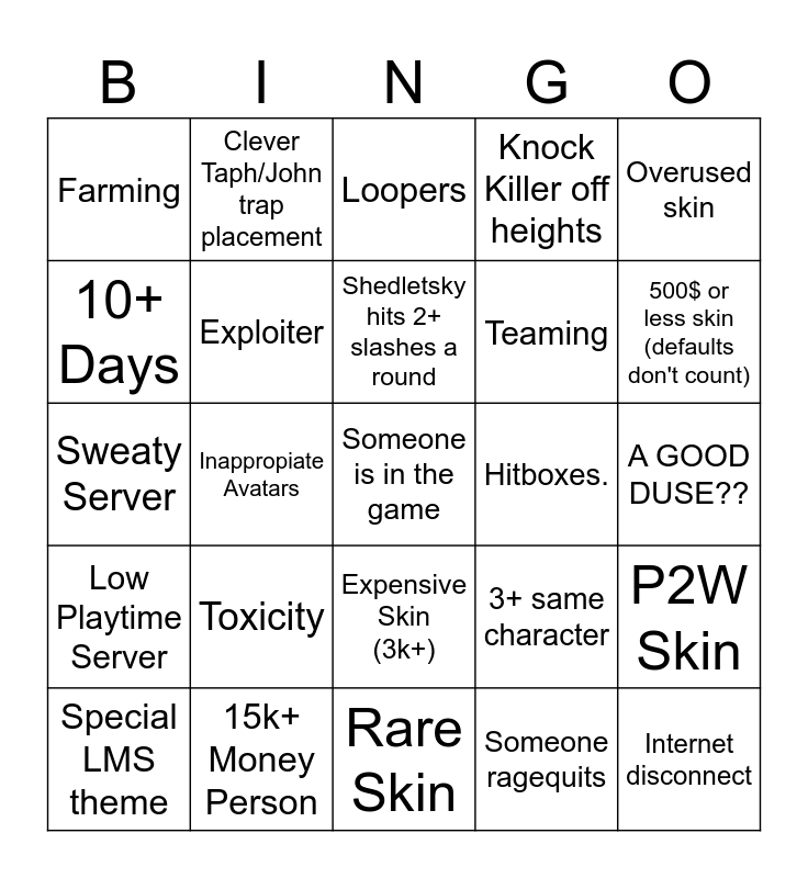 This bingo card has a free space and 24 words: Toxicity, 15k+ Money Person, Shedletsky hits 2+ slashes a round, Special LMS theme, Overused skin, Farming, 10+ Days, Clever Taph/John trap placement, Hitboxes., Expensive Skin (3k+), Teaming, Sweaty Server, 3+ same character, P2W Skin, Exploiter, Someone ragequits, A GOOD DUSE??, Loopers, 500$ or less skin (defaults don't count), Inappropiate Avatars, Internet disconnect, Low Playtime Server, Knock Killer off heights and Rare Skin.