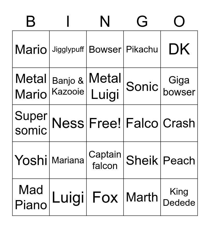 This bingo card has a free space and 24 words: Mariana, Luigi, Metal Luigi, Mad Piano, DK, Mario, Metal Mario, Jigglypuff, Falco, Captain falcon, Sonic, Super somic, Sheik, Peach, Banjo & Kazooie, Marth, Crash, Bowser, Giga bowser, Ness, King Dedede, Yoshi, Pikachu and Fox.