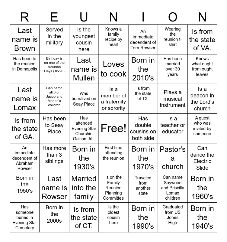 This bingo card has a free space and 48 words: Traveled from another state, Has been married over 30 years, Is the oldest cousin here, Has been to Seay Place, Was born/lived on Seay Place, A guest who was invited by someone, Served in the military, Born in the 2000s, Wearing the reunion t-shirt, First time attending the reunion, Is from the state of VA., Knows a family recipe by heart, Plays a musical instrument, Is from the state of TX., Born in the 1950's, Is a teacher or educator, Has been to the reunion in Demopolis, Knows what ought from ought leaves, Can name Saywood and Priscilla Lomax children, An immediate decendent of Tom Rowser, Born in the 2010's, Has attended Evening Star Churchin Gallion, AL., Last name is Brown, Birthday is on one of the Reunion Days (18-20), Born in the 1960's, Last name is Mullen, Is a deacon in the Lord's church, Has someone buried in Evening Star Cemetary, Is a member of a fraternity or sorority, Can name all 8 of Jacob and Mariahβs children, Graduated from US Jones High, Has double cousins on both side, Can dance the Electric Slide, Last name is Rowser, Is from the state of GA., Born in the 1970's, Pastor's a church, Last name is Lomax, Born in the 1930's, Married into the family, An immediate decendent of Abraham Rowser, Born in the 1940's, Is the youngest cousin here, Is from the state of CT., Loves to cook, Is on the Family Reunion Planning Committee, Has more than 3 siblings and Born in the 1990's.