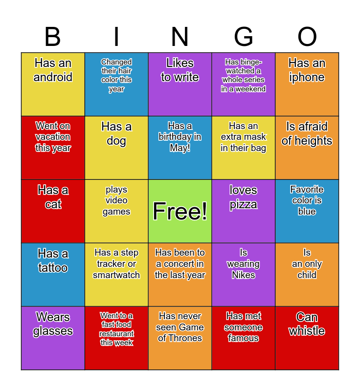 This bingo card has a free space and 24 words: Has a step tracker or smartwatch, Went to a fast food restaurant this week, Has a birthday in May!, Wears glasses, Has an iphone, Has an android, Went on vacation this year, Changed their hair color this year, loves pizza, Has been to a concert in the last year, Has an extra mask in their bag, Has a cat, Is wearing Nikes, Is an only child, Has a dog, Has met someone famous, Favorite color is blue, Likes to write, Is afraid of heights, plays video games, Can whistle, Has a tattoo, Has binge-watched a whole series in a weekend and Has never seen Game of Thrones.
