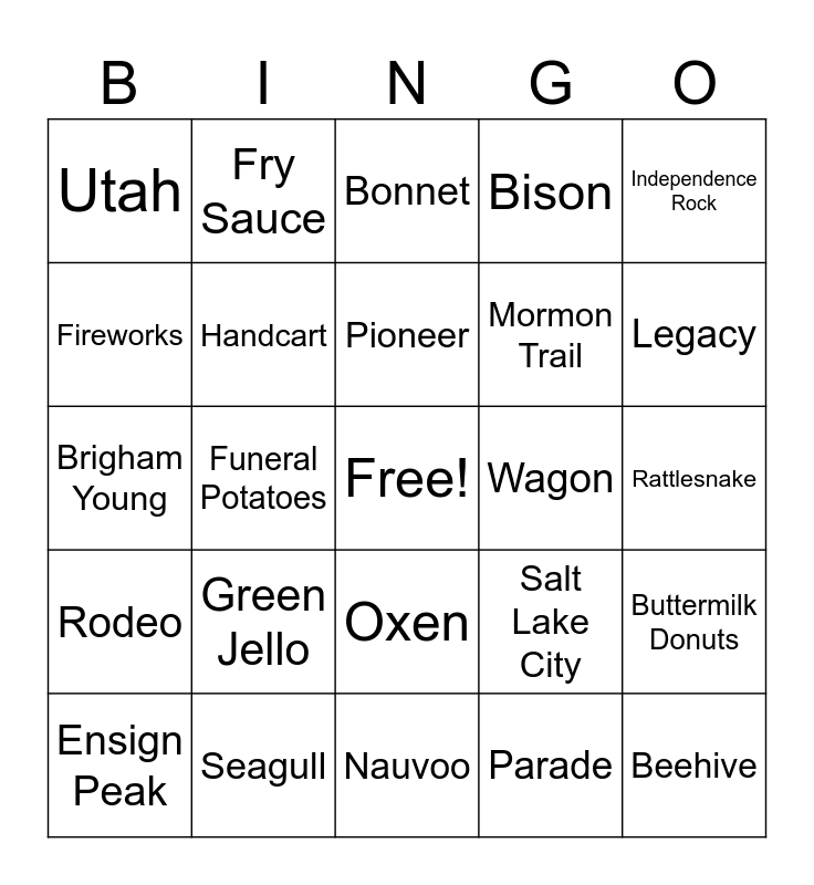 This bingo card has a free space and 24 words: Green Jello, Seagull, Pioneer, Ensign Peak, Independence Rock, Utah, Fireworks, Fry Sauce, Wagon, Oxen, Mormon Trail, Brigham Young, Salt Lake City, Buttermilk Donuts, Handcart, Parade, Rattlesnake, Bonnet, Legacy, Funeral Potatoes, Beehive, Rodeo, Bison and Nauvoo.