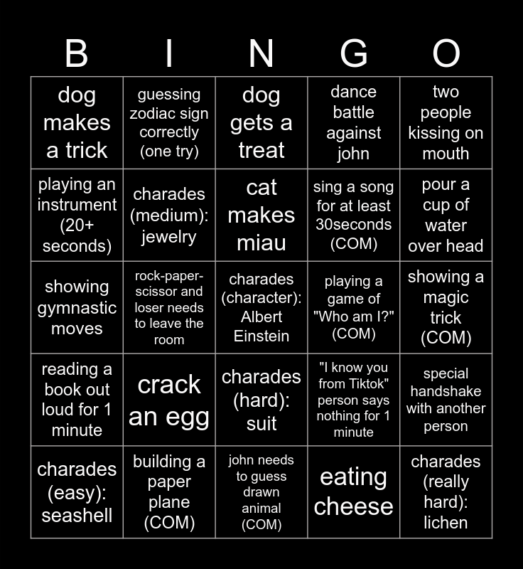 This bingo card has a free space and 24 words: crack an egg, building a paper plane (COM), cat makes miau, charades (easy): seashell, two people kissing on mouth, dog makes a trick, playing an instrument (20+ seconds), guessing zodiac sign correctly (one try), playing a game of "Who am I?" (COM), charades (hard): suit, sing a song for at least 30seconds (COM), showing gymnastic moves, "I know you from Tiktok" person says nothing for 1 minute, special handshake with another person, charades (medium): jewelry, eating cheese, showing a magic trick (COM), dog gets a treat, pour a cup of water over head, rock-paper-scissor and loser needs to leave the room, charades (really hard): lichen, reading a book out loud for 1 minute, dance battle against john and john needs to guess drawn animal (COM).