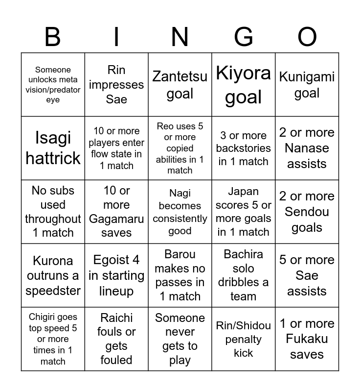 This bingo card has a free space and 24 words: Egoist 4 in starting lineup, Raichi fouls or gets fouled, Reo uses 5 or more copied abilities in 1 match, Chigiri goes top speed 5 or more times in 1 match, Kunigami goal, Someone unlocks meta vision/predator eye, Isagi hattrick, Rin impresses Sae, Japan scores 5 or more goals in 1 match, Barou makes no passes in 1 match, 3 or more backstories in 1 match, No subs used throughout 1 match, Bachira solo dribbles a team, 5 or more Sae assists, 10 or more players enter flow state in 1 match, Rin/Shidou penalty kick, 2 or more Sendou goals, Zantetsu goal, 2 or more Nanase assists, 10 or more Gagamaru saves, 1 or more Fukaku saves, Kurona outruns a speedster, Kiyora goal and Someone never gets to play.
