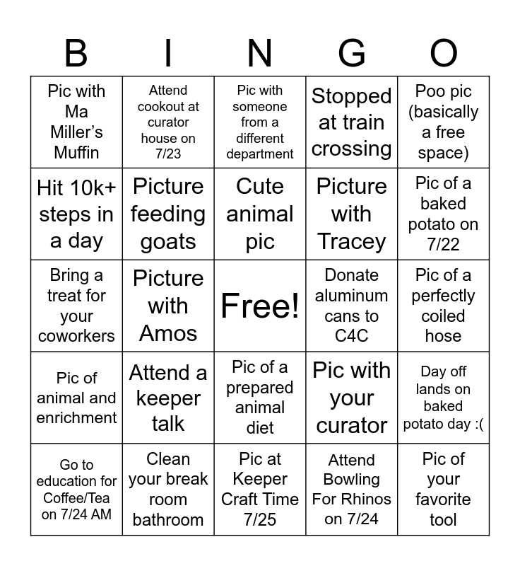 This bingo card has a free space and 37 words: Take an item to Lost and Found, Service dog on grounds radio call, Selfie in a different work area, Picture feeding goats, Day off lands on baked potato day :(, Attend a keeper talk, Cute animal pic, Mystery stain on uniform, Poo pic (basically a free space), Engage in conversation with a guest, Picture with Amos, Stopped at train crossing, Pic of your favorite tool, Pic of a perfectly coiled hose, Hit 10k+ steps in a day, Pic of animal and enrichment, Selfie with a Mold-A-Rama machine, Pic with someone from a different department, Pic of a prepared animal diet, Donate aluminum cans to C4C, Pic with Ma Miller’s Muffin, Pic of a baked potato on 7/22, Go to education for Coffee/Tea on 7/24 AM, Pic at Keeper Craft Time 7/25, Pic at All Staff Luncheon on 7/24, Attend Bowling For Rhinos on 7/24, Attend cookout at curator house on 7/23, Pick up trash blown into habitat, Share a zoo post on social media, Park in far “Camel Lot” for 1 day, Sweep or vacuum your area’s break room, Clean your break room bathroom, Bring a treat for your coworkers, Compliment a coworker, Pic with your curator, Picture with Tracey and Wish a coworker a Happy Zookeeper Week!.