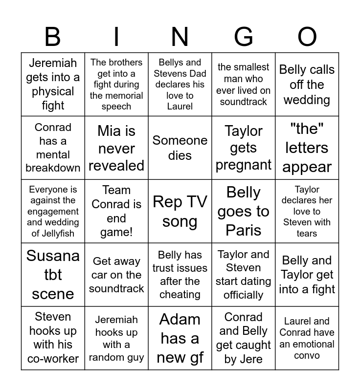 This bingo card has a free space and 24 words: Steven hooks up with his co-worker, Get away car on the soundtrack, Someone dies, Conrad and Belly get caught by Jere, Belly calls off the wedding, Jeremiah gets into a physical fight, The brothers get into a fight during the memorial speech, Bellys and Stevens Dad declares his love to Laurel, Belly goes to Paris, Taylor declares her love to Steven with tears, Everyone is against the engagement and wedding of Jellyfish, Mia is never revealed, Taylor and Steven start dating officially, Belly and Taylor get into a fight, Conrad has a mental breakdown, Jeremiah hooks up with a random guy, Adam has a new gf, the smallest man who ever lived on soundtrack, "the" letters appear, Susana tbt scene, Team Conrad is end game!, Belly has trust issues after the cheating, Taylor gets pregnant and Laurel and Conrad have an emotional convo.