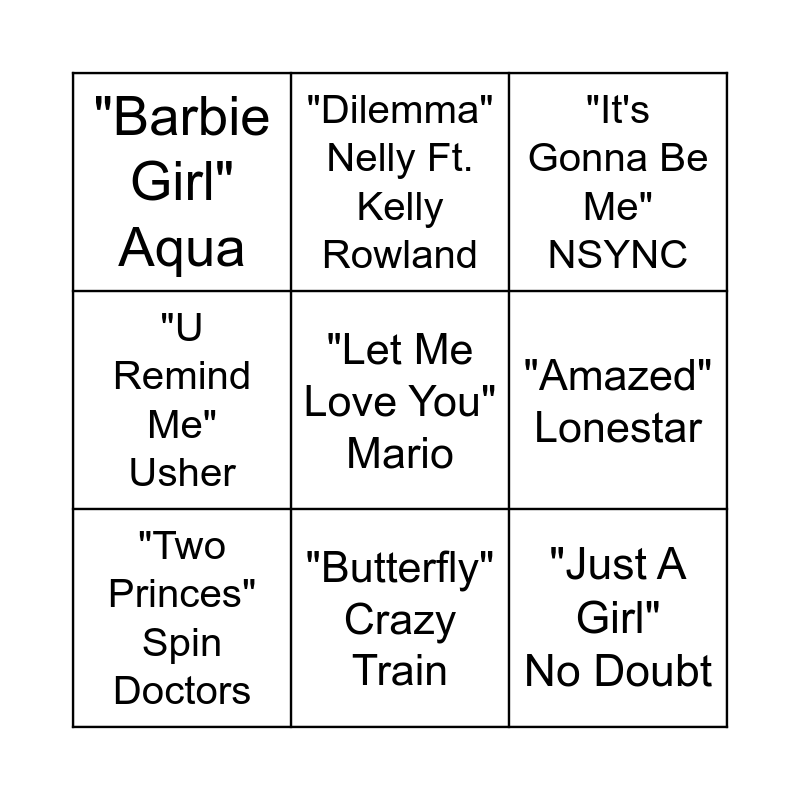 This bingo card has 25 words: "Unwell" Matchbox Twenty, "Fighter" Christina Aguilera, "Butterfly" Crazy Train, "Love Don't Cost A Thing" Jennifer Lopez, "Let Me Love You" Mario, "Barbie Girl" Aqua, "Amazed" Lonestar, "Dilemma" Nelly Ft. Kelly Rowland, "Believe" Cher, "Baby One More Time" Britney Spears, "Just A Girl" No Doubt, "You Gotta Be" Des'ree, "Absolutely (Story of a Girl)" Nine Days, "Say My Name" Destiny's Child, "Two Princes" Spin Doctors, "How You Remind Me" Nickleback, "I Want It That Way" Backstreet Boys, "It's Gonna Be Me" NSYNC, "Summer Girls" LFO, "Take Me Out" Franz Ferdinand, "Say" John Mayer, "No Scrubs" TLC, "Get The Party Started" Pink, "U Remind Me" Usher and "I Will Always Love You" Whitney Houston.
