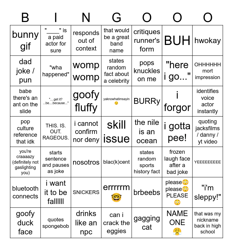 This bingo card has 57 words: that was my nickname back in high school, identifies voice actor instantly, poor man's british accent, bunny gif, THIS. IS. OUT. RAGEOUS., errrrrm 🤓, hwokay, they should put a golf hole here, "wha happened", brbeebs, that would be a great band name, bluetooth connects, you're craaaazy (definitely not gaslighting you), quoting jacksfilms / danny / yt video, drinks like an npc, starts sentence and pauses as joke, critiques runner's form, pops knuckles on me, ugh can't we just have a moment, "here i go...", OHHHHHH mort impression, nosotros, BURRy, responds out of context, iz goooood, dad joke / pun, i gotta pee!, "is it football season yetttttt", womp womp, blac(k)cent, don karnage ears / accent, YEEEEEEEEE, quotes spongebob, can i crack the eggies, babe there's an ant on the slide, BUH, i want it to be fallllll, states random fact about a celebrity, SNICKERS, "....get it? ...be....because...", "____" is a paid actor for sure, yaknowhatimsayin 😏, skill issue, "finds" me then smiles, "i'm sleppy!", goofy duck face, goofy fluffy, pop culture reference that idk, gagging cat, frozen laugh face after a bad joke, the nile is an ocean, i cannot confirm nor deny, states random sports history fact, please😳 please😳 PLEASE😳, NAME ONE 😤, i forgor and POGGERS.