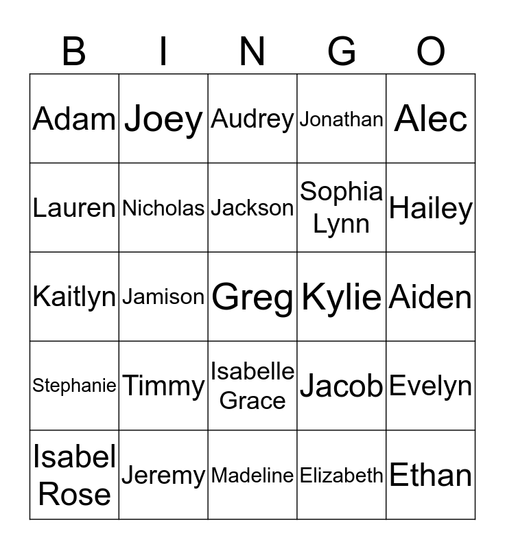 This bingo card has 25 words: Timmy, Madeline, Jackson, Isabel Rose, Alec, Adam, Lauren, Joey, Kylie, Isabelle Grace, Sophia Lynn, Kaitlyn, Jacob, Evelyn, Nicholas, Ethan, Aiden, Audrey, Hailey, Jamison, Greg, Jeremy, Stephanie, Jonathan and Elizabeth.