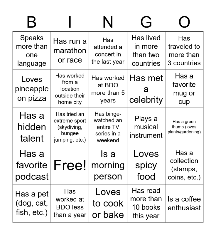 This bingo card has a free space and 24 words: Free!, Has worked at BDO less than a year, Has worked at BDO more than 5 years, Has a pet (dog, cat, fish, etc.), Has traveled to more than 3 countries, Speaks more than one language, Loves pineapple on pizza, Has run a marathon or race, Plays a musical instrument, Is a morning person, Has met a celebrity, Has a hidden talent, Loves spicy food, Has a collection (stamps, coins, etc.), Has worked from a location outside their home city, Has read more than 10 books this year, Has a green thumb (loves plants/gardening), Has attended a concert in the last year, Has a favorite mug or cup, Has tried an extreme sport (skydiving, bungee jumping, etc.), Is a coffee enthusiast, Has a favorite podcast, Has lived in more than two countries and Loves to cook or bake.