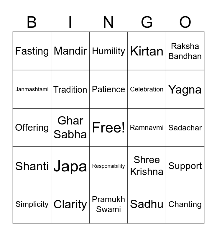 This bingo card has a free space and 105 words: 🟣 S, Diwali, Raksha Bandhan, Tilak, Mala, Seva, Bhajan, Ghar Sabha, Guru, Thakorji, Mahant Swami, Akshar, Shikshapatri, Mahabharat, Arti, Love, Humility, Gratitude, Cleanliness, Sanskar, Peace, 🔵 W, Holi, Navratri, Chandlo, Japa, Yagna, Kirtan, Ravisabha, Swaminarayan, Shree Krishna, Sadhu, Purushottam, Bhagavad Gita, Shiv, Devotion, Respect, Kindness, Patience, Clarity, Family, Shanti, 🟠A, Janmashtami, Satsang Diksha, Fasting, Prasad, Chanting, Satsang, Santos, Maharaj, Shree Ram, Akshar, Vachanamrut, Ramayan, Arti, Dharma, Obedience, Compassion, Responsibility, Sadachar, Unity, Joy, 🟢 M, Shivratri, Ganesh Chaturthi, Abhishek, Mandir, Offering, Ghar Sabha, Pramukh Swami, Sadhu, Vachanamrut, Ramayan, Shiv, Bhakti, Honesty, Forgiveness, Simplicity, Sadachar, Harmony, Sharing, Inspiration, Tradition, 🔴 I, Ramnavmi, Ekadashi, Aarti, Darshan, Offering, Learning, Culture, Community, Service, Support, Discipline, Guidance, Positivity, Celebration, Festival, Shubh, Tirth, Temple, Reading and Family Values.