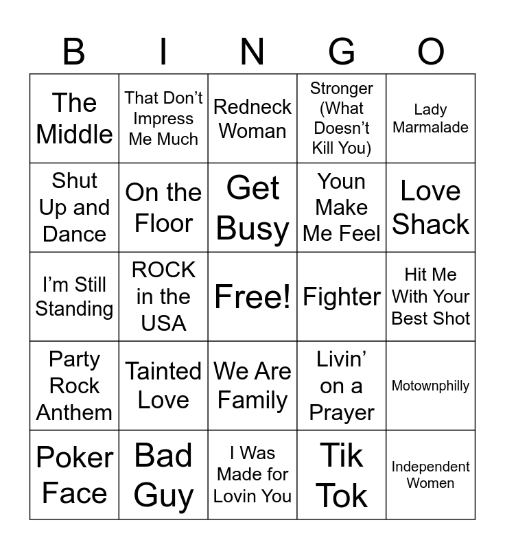 This bingo card has a free space and 60 words: Sweet Nothing, Bad Guy, Feel It Still, Party Rock Anthem, Tik Tok, Baby, On the Floor, Like a G6, Youn Make Me Feel, We Found Love, Stronger (What Doesn’t Kill You), Can’t Hold Us, Shut Up and Dance, Time of Our Lives, Look What You Made Me Do, The Middle, Independent Women, Lady Marmalade, Soak up the Sun, Get Busy, Fighter, Redneck Woman, Poker Face, Motownphilly, Just a Girl, Wannabe, Livin’ La Vida Loca, Good Vibrations, Love Shack, I’m Too Sexy, I’m Every Woman, Rhythm of the Night, Barbie Girl, All Star, That Don’t Impress Me Much, Call Me, Whip It, ROCK in the USA, Walk Like an Egyptian, I’m Still Standing, Mickey, Tainted Love, Hit Me With Your Best Shot, All She Wants to do is Dance, Livin’ on a Prayer, Bust a Move, Never Gonna Give You Up, Barracuda, My Sherona, We Are Family, I Was Made for Lovin You, Spirit in the Sky, Me & Bobby McGee, Love Train, Dancing in the Moonlight, Come & Get Your Love, Hollywood Swinging, Get Down on It, You Sexy Thing and Boogie Oogie Oogie.