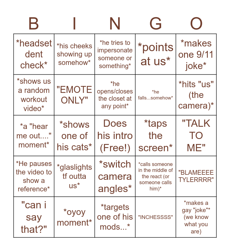 This bingo card has a free space and 45 words: *acts zesty*, *makes a gay "joke"* (we know what you are), *drinks outta something that isnt a waterbottle/cup*, "can i say that?", "I CAN DO THAT!!" *and fails*, "INCHESSSS", *he tries to impersonate someone or something*, *black screen*, *makes one 9/11 joke*, *oyoy moment*, *points at us*, *taps the screen*, *switch camera angles*, *glaslights tf outta us*, "THAT DOESNT COUNT!! IT DOESNT COUNT", *targets one of his mods...*, STUTTER OF DOOM AND DESPAIR, *a "hear me out...." moment*, 'I SAID AYOOOOOO" (battle rap), *hits "us" (the camera)*, *his cheeks showing up somehow*, *his cat(s) scratching the chair up*, *headphone malfunction*, *headset dent check*, *he feeds into the black jokes....*, "TALK TO ME", *posture check*, *spray bottle*, *calls someone in the middle of the react (or someone calls him)*, *He pauses the video to show a reference*, *he mouth breaths on the camera*, "BLAMEEEE TYLERRRR", "aye man, say man", "you good mud??", "EDITORRRRRR", *shows one of his cats*, *he leaves the room*, *mentions his stats*, *explains a god awful joke he made*, *he opens/closes the closet at any point*, *shows us a random workout video*, *he falls...somehow*, *he scams us at least once*, "EMOTE ONLY" and *one mexican joke*.