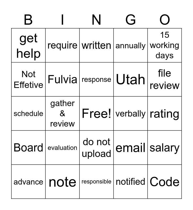 This bingo card has a free space and 24 words: evaluation, note, response, advance, 15 working days, get help, Not Effetive, require, verbally, do not upload, Utah, schedule, email, salary, Fulvia, notified, rating, written, file review, gather & review, Code, Board, annually and responsible.