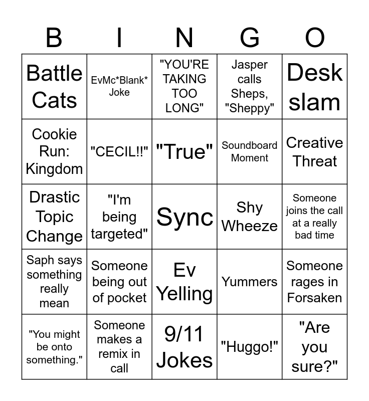 This bingo card has 25 words: Someone being out of pocket, 9/11 Jokes, "True", "You might be onto something.", Desk slam, Battle Cats, Cookie Run: Kingdom, EvMc*Blank* Joke, Shy Wheeze, Ev Yelling, Soundboard Moment, Drastic Topic Change, Yummers, Someone rages in Forsaken, "CECIL!!", "Are you sure?", Someone joins the call at a really bad time, "YOU'RE TAKING TOO LONG", Creative Threat, "I'm being targeted", Sync, Someone makes a remix in call, Saph says something really mean, Jasper calls Sheps, "Sheppy" and "Huggo!".