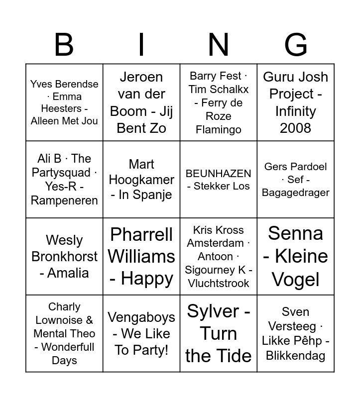 This bingo card has 40 words: Lustrum U.V.S.V./N.V.V.S.U. - Lotje, Kris Kross Amsterdam · Antoon · Sigourney K - Vluchtstrook, Roxy Dekker - Sugardaddy, BEUNHAZEN - Stekker Los, De Jeugd Van Tegenwoordig - Sterrenstof, Tino Martin · Mart Hoogkamer - Hartslag Van De Stad, Gers Pardoel · Sef - Bagagedrager, Coolio · L.V. - Gangsta's Paradise, Ali B · The Partysquad · Yes-R - Rampeneren, Sven Versteeg · Likke Pêhp - Blikkendag, Senna - Kleine Vogel, Guru Josh Project - Infinity 2008, Charly Lownoise & Mental Theo - Wonderfull Days, Sylver - Turn the Tide, Vengaboys - We Like To Party!, Paul Elstak - Rainbow in the Sky, Volbeat - Still Counting, Yves Berendse · Emma Heesters - Alleen Met Jou, OBZ - Ik Ben Kachel, Barry Fest · Tim Schalkx - Ferry de Roze Flamingo, Effe Serieus - Baila de Gasolina, Jan Smit · 3JS - [Die Man Is] Verliefd, Wesly Bronkhorst - Amalia, Mart Hoogkamer - In Spanje, Scooter - How Much Is The Fish?, Paul Elstak - Luv U More, Atomic Kitten - Whole Again, The Kelly Family - Fell In Love With An Alien, Yves Berendse - Terug In De Tijd, Martin Morero - Spijt Is Voor Later, Mart Hoogkamer - Ik Spaar Geen Centen, Zonnie M - Zon Op M'n Piemel, Robert van Hemert - Zoet, Zout, Zuur, Mariah Carey - All I Want for Christmas Is You, Pharrell Williams - Happy, Def Rhymz - Schudden, Aqua - Barbie Girl, Lasgo - Something, Jeroen van der Boom - Jij Bent Zo and Jop - Jij bent de zon.