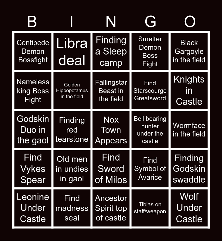 This bingo card has 78 words: Finding a Frost camp, Finding a Bleed camp, Finding a Sleep camp, Find A Poison Camp, Rot Area Appears, Find A Madness Camp, No camp with bosses weakness, Loretta in the field, Augar invades, Pest invades, Morgott invades, Dancer Boss Fight, Smelter Demon Boss Fight, Centipede Demon Bossfight, Morgott boss, Nameless king Boss Fight, Bloodhound Knight in goal, Old men in undies in gaol, Crucible in the gaol, Wormface in the field, Moose in the wild, Black Gargoyle in the field, Godskin Duo in the gaol, Fallingstar Beast in the field, Golden Hippopotamus in the field, Black Knife Assassin in the field, Find Ancient Hero of Zamor, Giants in castle, Wyrm top of castle, Crucible knights in Castle, Knights in Castle, Erdtree top of castle, Ancestor Spirit top of castle, Wolf Under Castle, Leonine Under Castle, Bell bearing hunter under the castle, Royal Revenant Under Castle, Dragon in the Lake,, Bell Bearing Hunter in Lake, Nox Town Appears, Finding cords end, Volcano Area, Frenzy tower activate, Night Horde, Wandering Mausoleum appears, Libra deal, Prod finds random treasure, Special merchant in the field, Gradual flask restoration, Wending grace appears, Finding Godskin swaddle, Finding red tearstone, Find Symbol of Avarice, Find Warrior Jar Talisman, Find Bull Goat Talisman, Find Great Turtle Shell, Visage Shield Found, Finding Fingerprint shield, Find Varre's bouquet, Find Sword of Milos, Find Starscourge Greatsword, Find Dragon King's Cragblade, Find Magma Blade, Find Rivers Of Blood, Find Rosus' Axe, Find Cinquedea Dagger, Find Scorpion's Stinger Dagger, Golden Order Seal, Find Vykes Spear, Find madness seal, Finding a bubble blower, Find Bloodhound Fang, Finding MoonLight Greatsword, Thorn sorc on a staff/weapon, Tibias on staff/weapon, Shadow lure on weapon/seal, Find The Shield of the Guilty and Weapon with 2 stats.