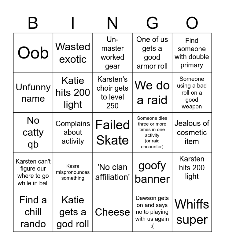 This bingo card has a free space and 24 words: Kasra mispronounces something, Katie gets a god roll, Karsten's choir gets to level 250, Find a chill rando, Find someone with double primary, Oob, Unfunny name, Wasted exotic, Someone dies three or more times in one activity (or raid encounter), 'No clan affiliation', We do a raid, No catty qb, goofy banner, Karsten hits 200 light, Katie hits 200 light, Dawson gets on and says no to playing with us again :(, Jealous of cosmetic item, Un-master worked gear, Someone using a bad roll on a good weapon, Complains about activity, Whiffs super, Karsten can't figure our where to go while in ball, One of us gets a good armor roll and Cheese.
