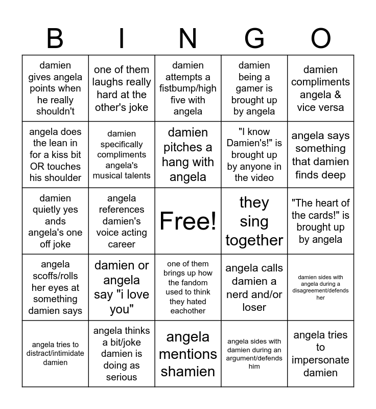 This bingo card has a free space and 24 words: damien or angela say "i love you", angela thinks a bit/joke damien is doing as serious, damien pitches a hang with angela, angela tries to distract/intimidate damien, damien compliments angela & vice versa, damien gives angela points when he really shouldn't, angela does the lean in for a kiss bit OR touches his shoulder, one of them laughs really hard at the other's joke, they sing together, one of them brings up how the fandom used to think they hated eachother, "I know Damien's!" is brought up by anyone in the video, damien quietly yes ands angela's one off joke, angela calls damien a nerd and/or loser, damien sides with angela during a disagreement/defends her, damien specifically compliments angela's musical talents, angela sides with damien during an argument/defends him, "The heart of the cards!" is brought up by angela, damien attempts a fistbump/high five with angela, angela says something that damien finds deep, angela references damien's voice acting career, angela tries to impersonate damien, angela scoffs/rolls her eyes at something damien says, damien being a gamer is brought up by angela and angela mentions shamien.