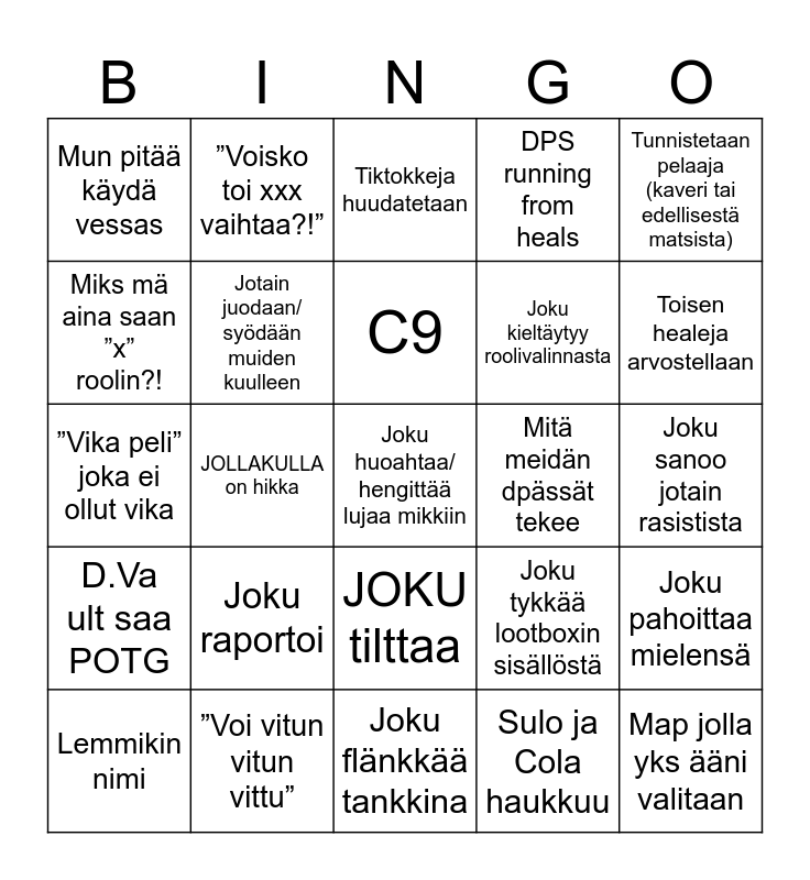 This bingo card has 25 words: Joku raportoi, Joku flänkkää tankkina, C9, Lemmikin nimi, Tunnistetaan pelaaja (kaveri tai edellisestä matsista), Mun pitää käydä vessas, Miks mä aina saan ”x” roolin?!, ”Voisko toi xxx vaihtaa?!”, Mitä meidän dpässät tekee, JOKU tilttaa, Joku kieltäytyy roolivalinnasta, ”Vika peli” joka ei ollut vika, Joku tykkää lootboxin sisällöstä, Joku pahoittaa mielensä, Jotain juodaan/ syödään muiden kuulleen, Map jolla yks ääni valitaan, Joku sanoo jotain rasistista, Tiktokkeja huudatetaan, Toisen healeja arvostellaan, JOLLAKULLA on hikka, Joku huoahtaa/ hengittää lujaa mikkiin, ”Voi vitun vitun vittu”, D.Va ult saa POTG, DPS running from heals and Sulo ja Cola haukkuu.