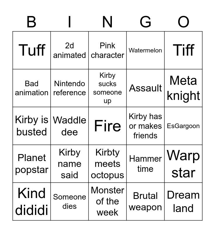 This bingo card has a free space and 24 words: Kirby name said, Someone dies, Kirby sucks someone up, Kind dididi, Tiff, Tuff, Bad animation, 2d animated, Kirby has or makes friends, Kirbty meets octopus, Assault, Kirby is busted, Hammer time, Warp star, Nintendo reference, Brutal weapon, EsGargoon, Pink character, Meta knight, Waddle dee, Dream land, Planet popstar, Watermelon and Monster of the week.