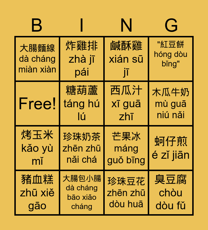 This bingo card has 16 words: 大腸包小腸 dà cháng bāo xiǎo cháng, 蚵仔煎 é zǐ jiān, 鹹酥雞 xián sū jī, 大腸麵線 dà cháng miàn xiàn, 烤玉米 kǎo yù mǐ, 炸雞排 zhà jī pái, 芒果冰 máng guǒ bīng, 珍珠豆花 zhēn zhū dòu huā, Free!, 糖葫蘆 táng hú lú, 豬血糕 zhū xiě gāo, "紅豆餅 hóng dòu bǐng", 珍珠奶茶 zhēn zhū nǎi chá, 木瓜牛奶 mù guā niú nǎi, 西瓜汁 xī guā zhī and 臭豆腐 chòu dòu fǔ.
